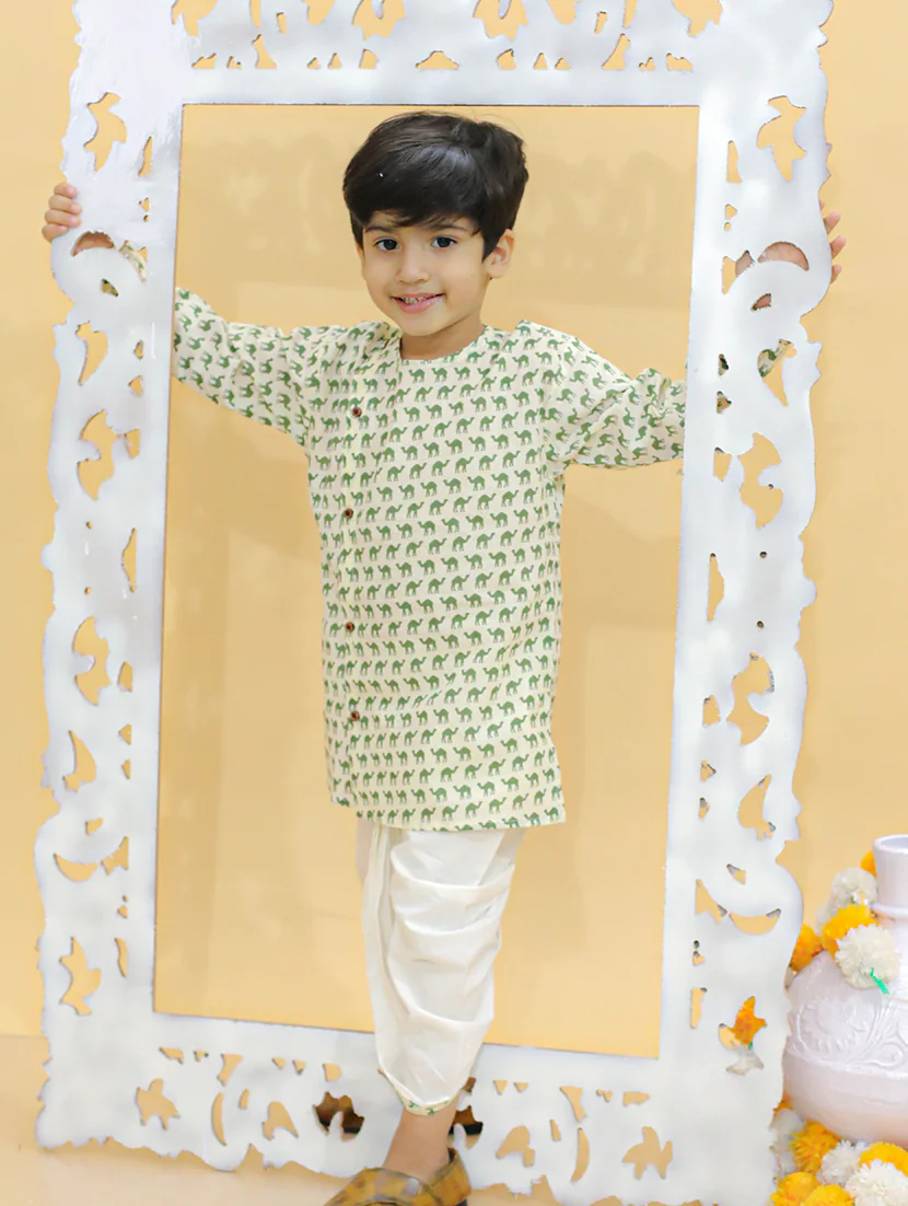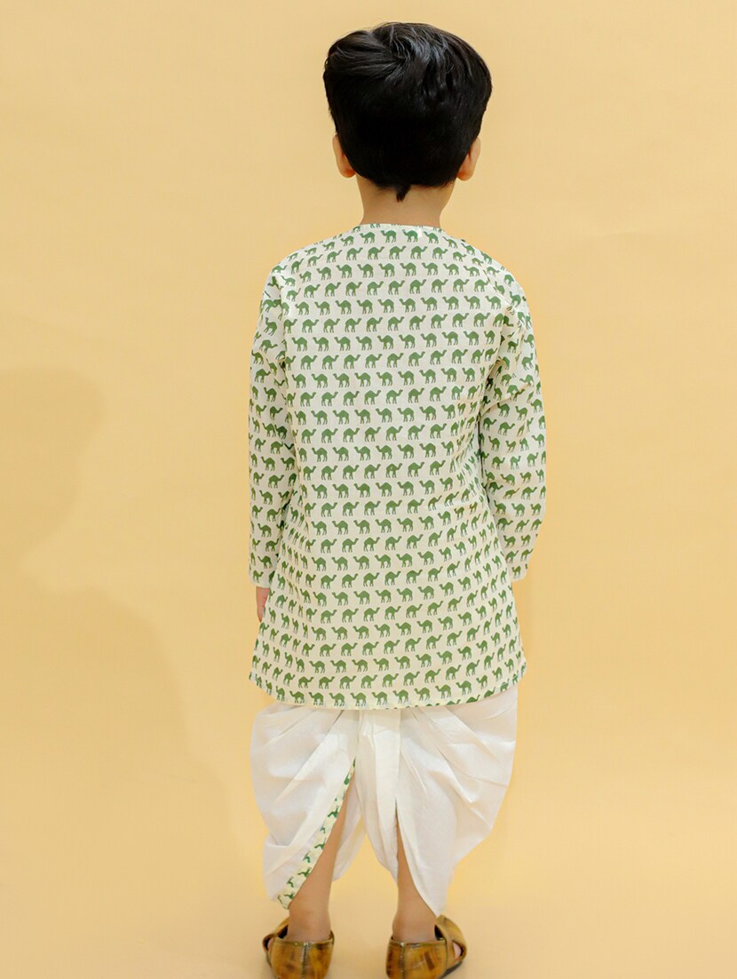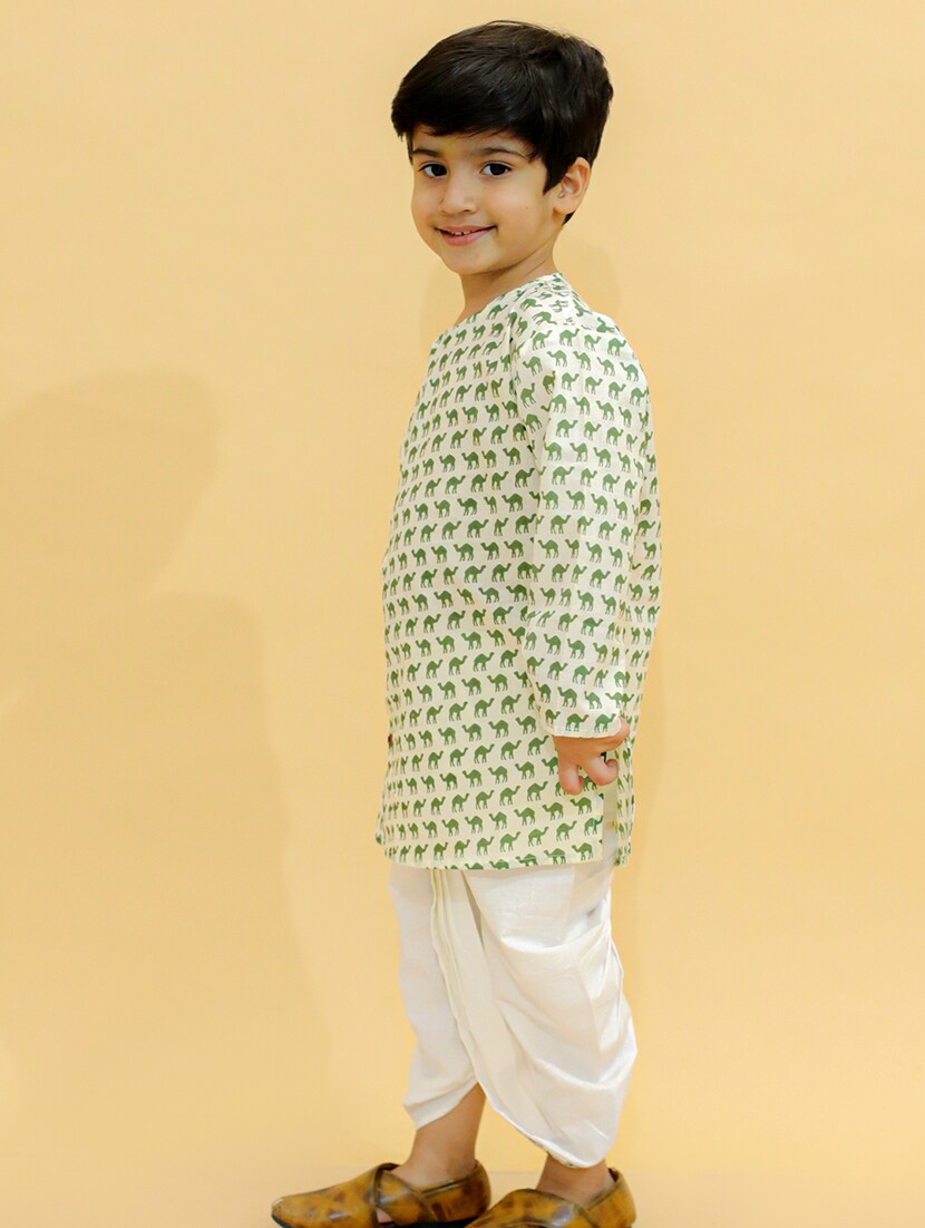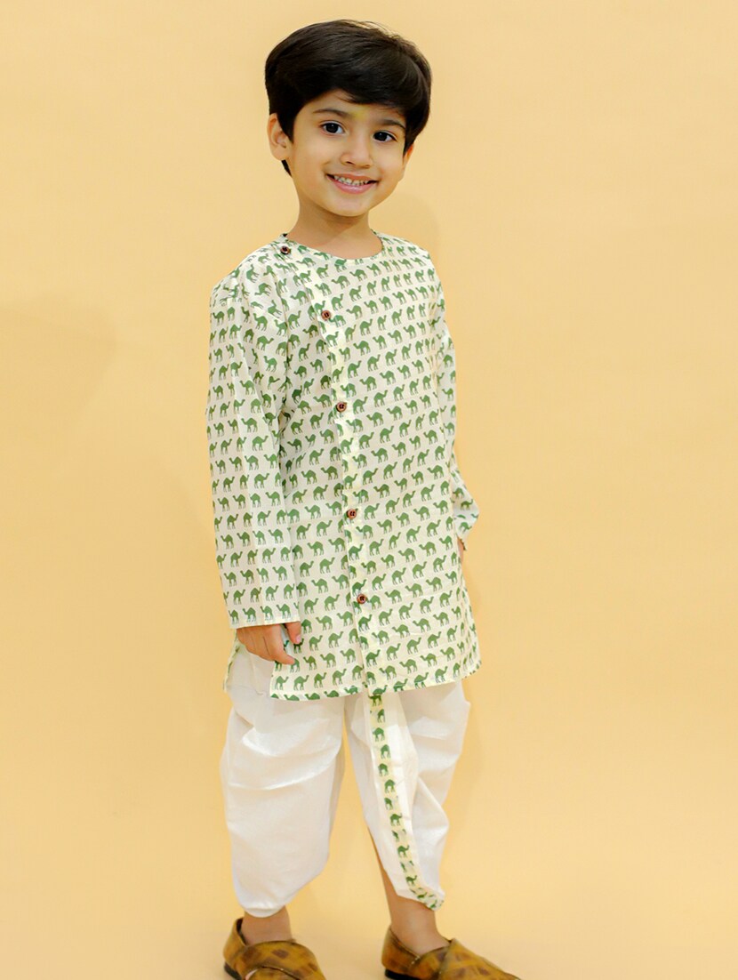 A boys’ mandarin neck printed dhoti kurta set, combining a stylish mandarin collar with vibrant prints and a classic dhoti for festive occasions.