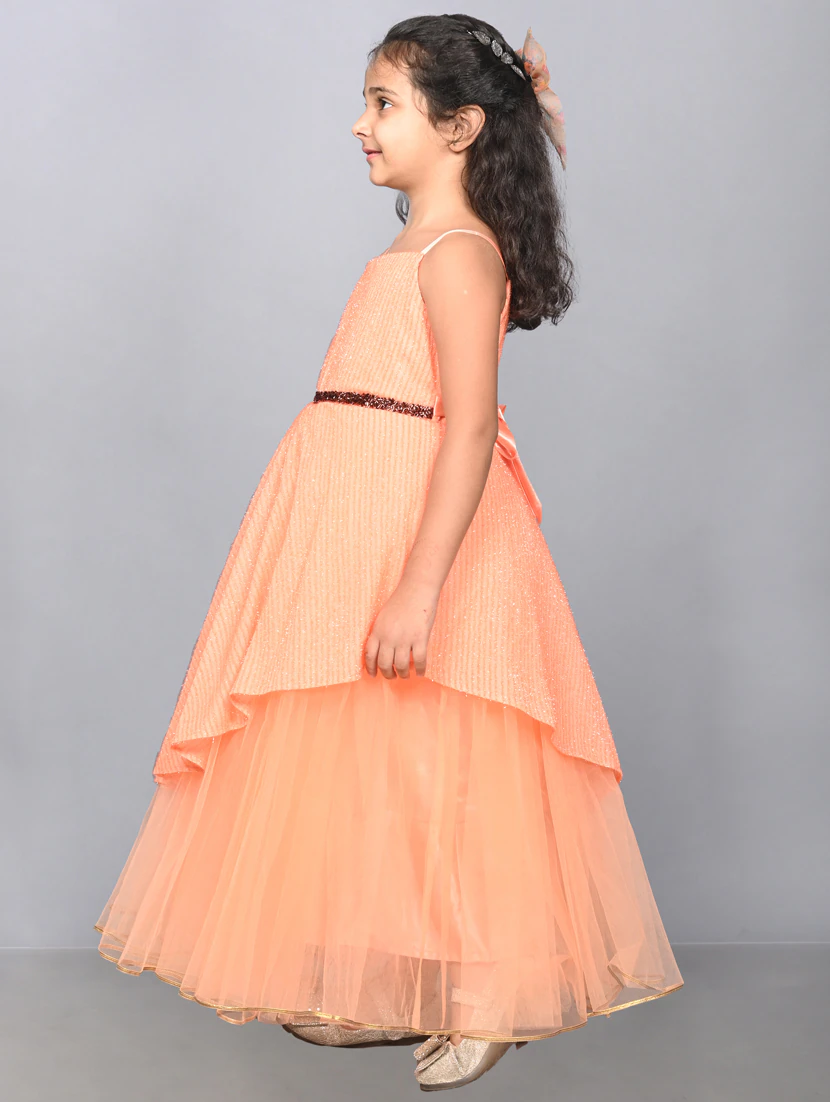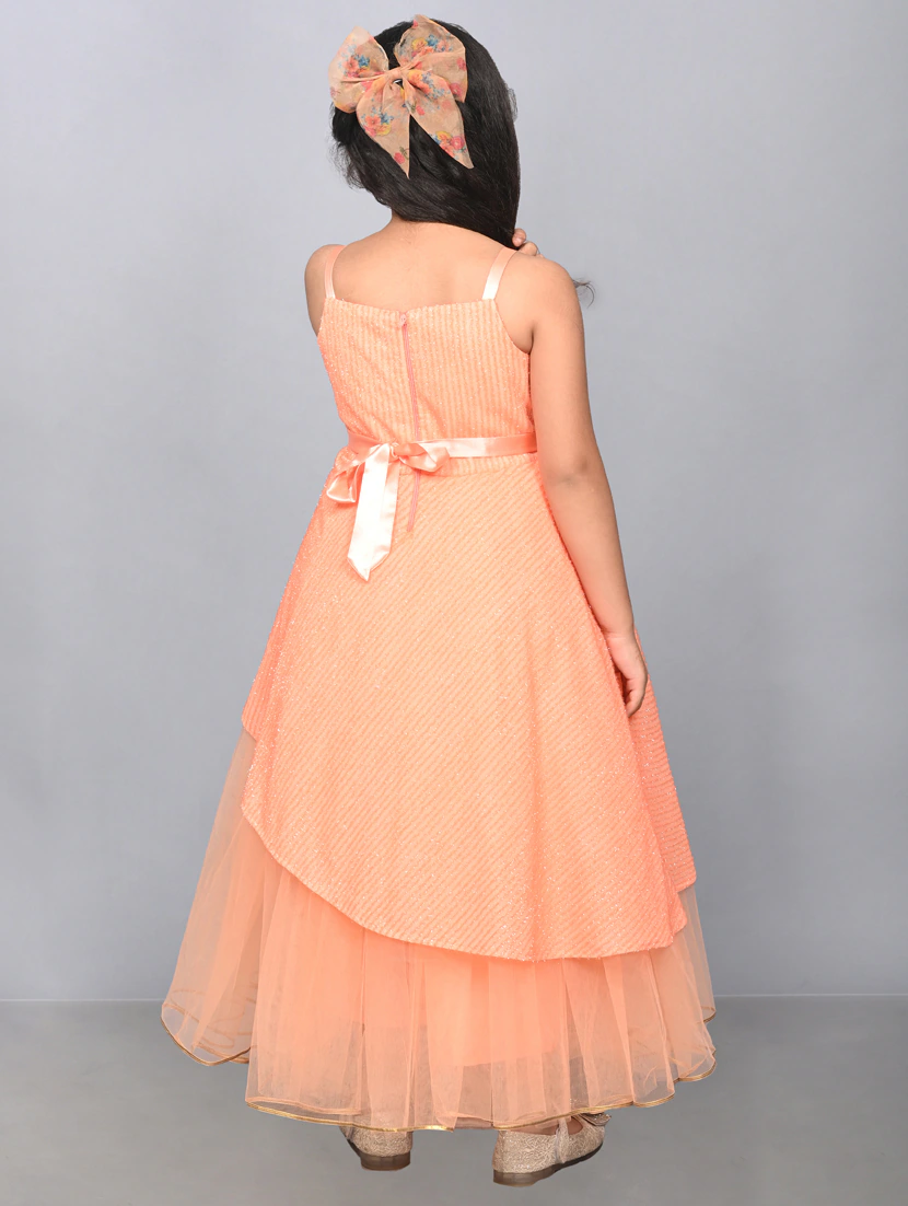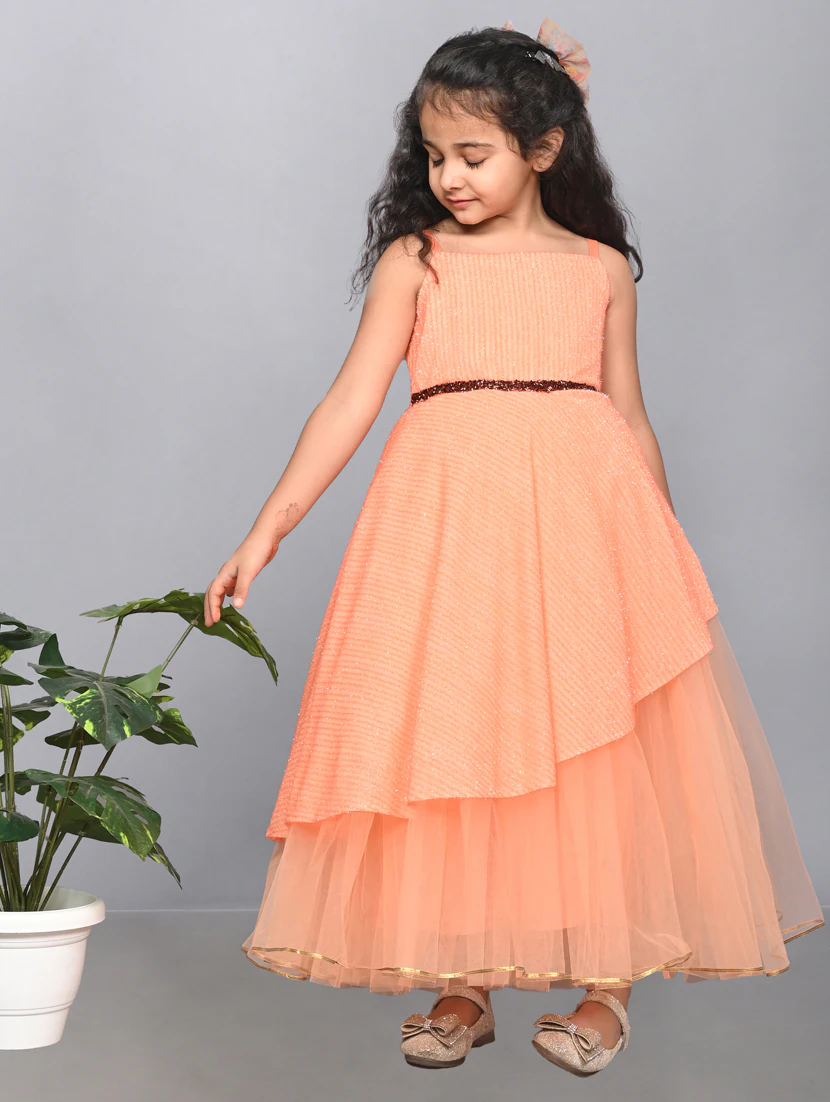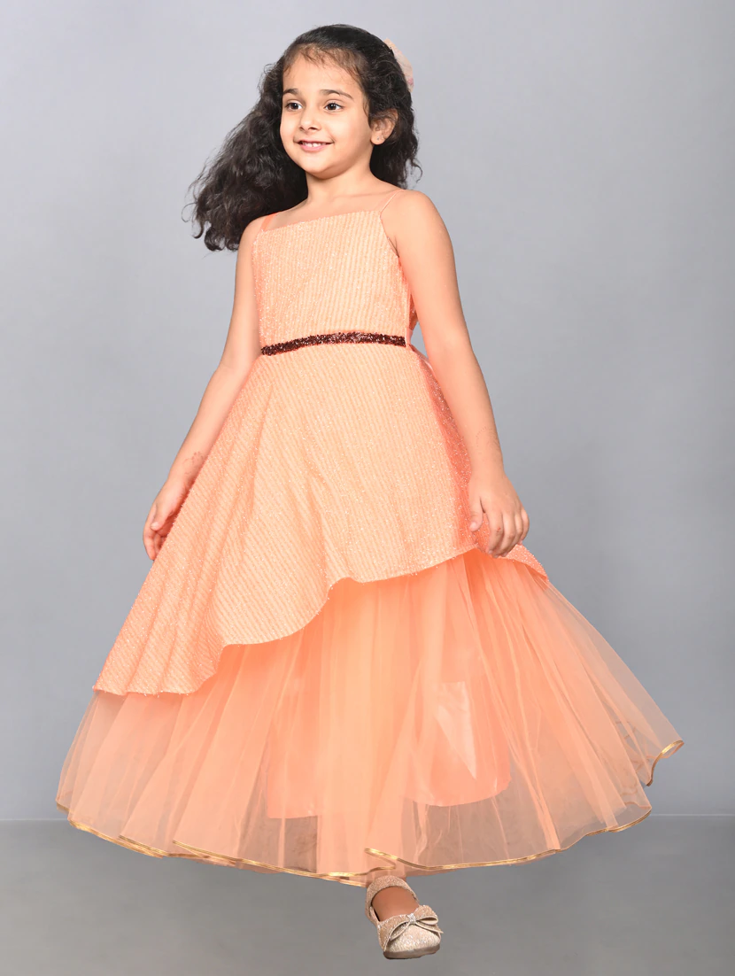 A girls’ orange frock with intricate self-design detailing, offering a vibrant and elegant look with comfortable fabric.