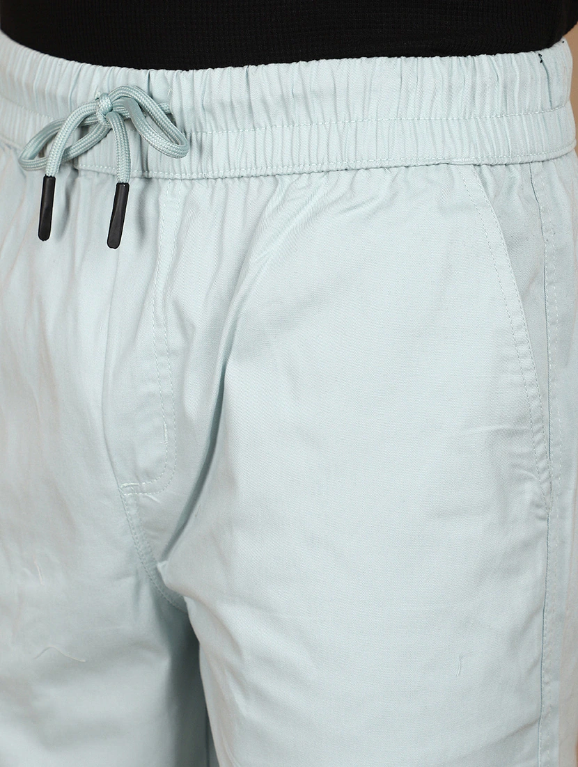 Green denim jogger jeans with a comfortable fit, featuring an elastic waistband and cuffs for a modern, casual look.