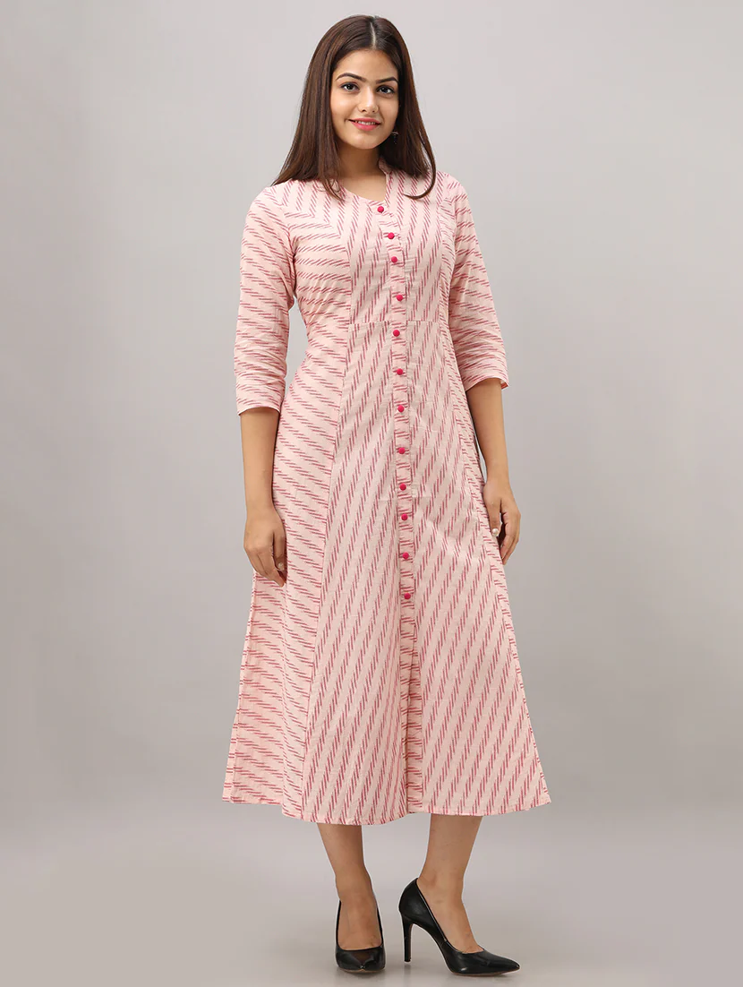 An A-line dress with a traditional Ikat print, offering a flattering fit and comfortable fabric, perfect for any occasion.
