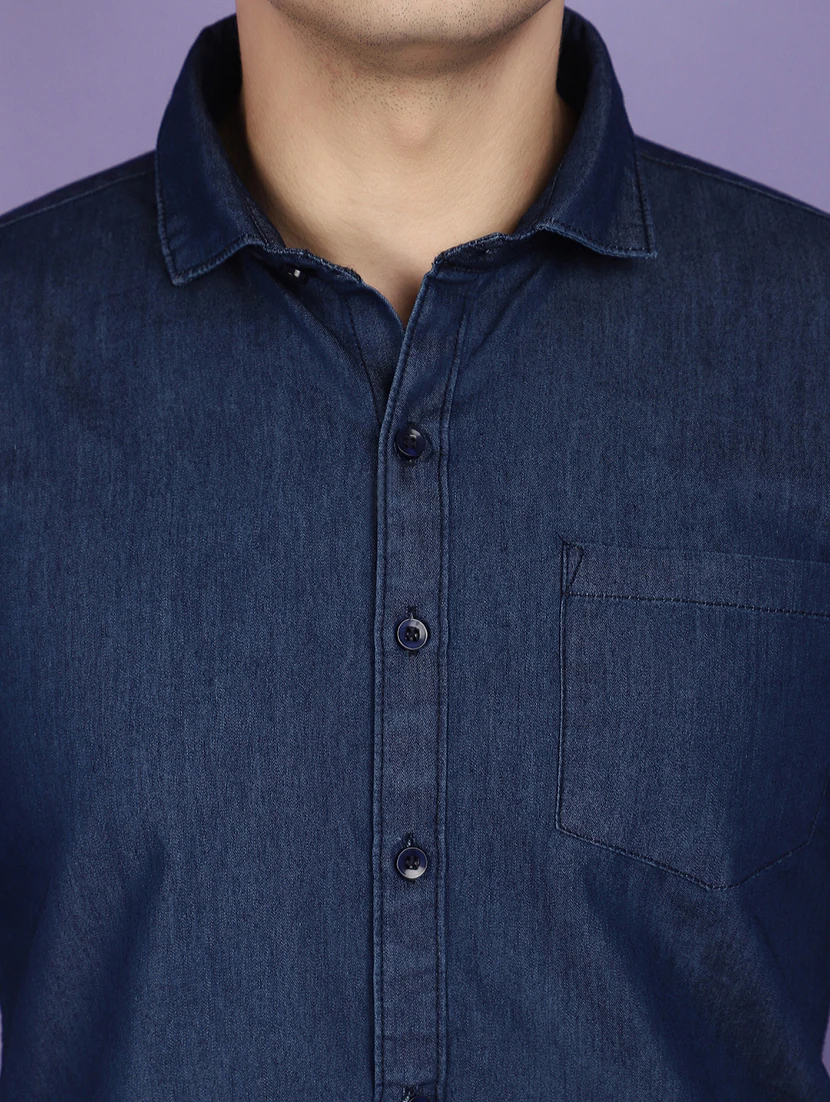 A navy blue denim casual shirt with a relaxed fit, featuring durable fabric and classic button-down styling.
