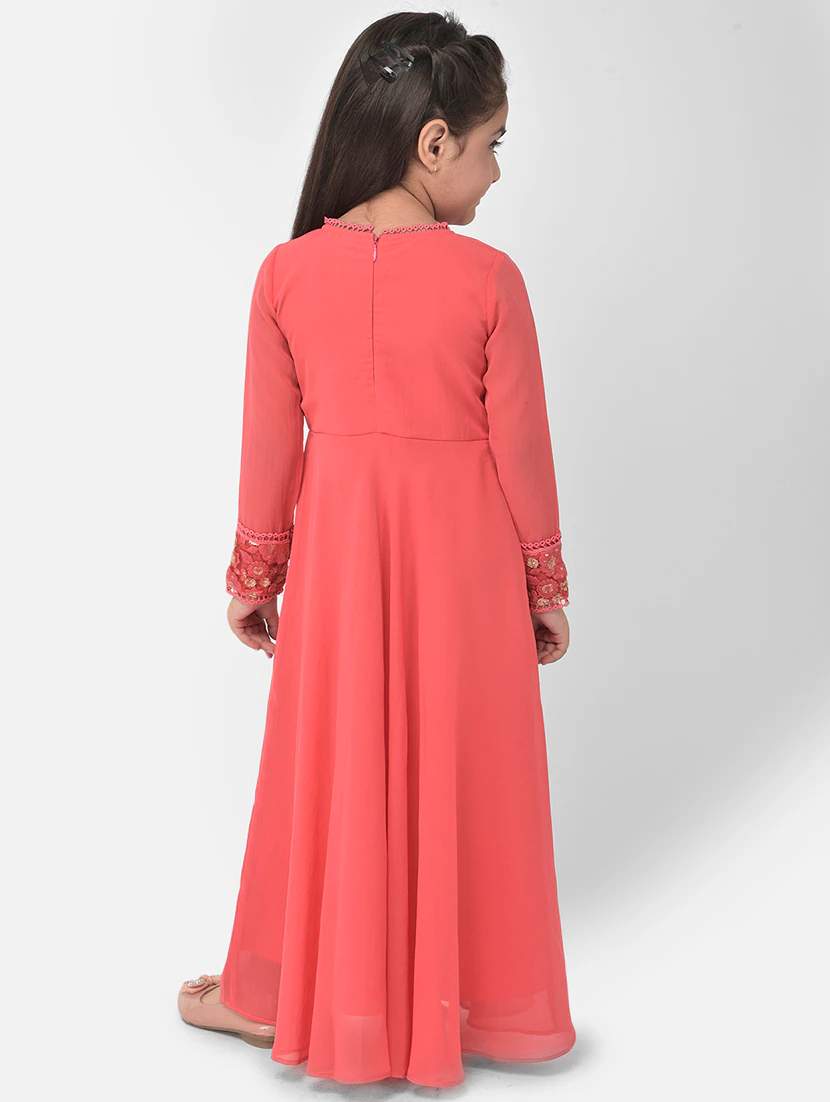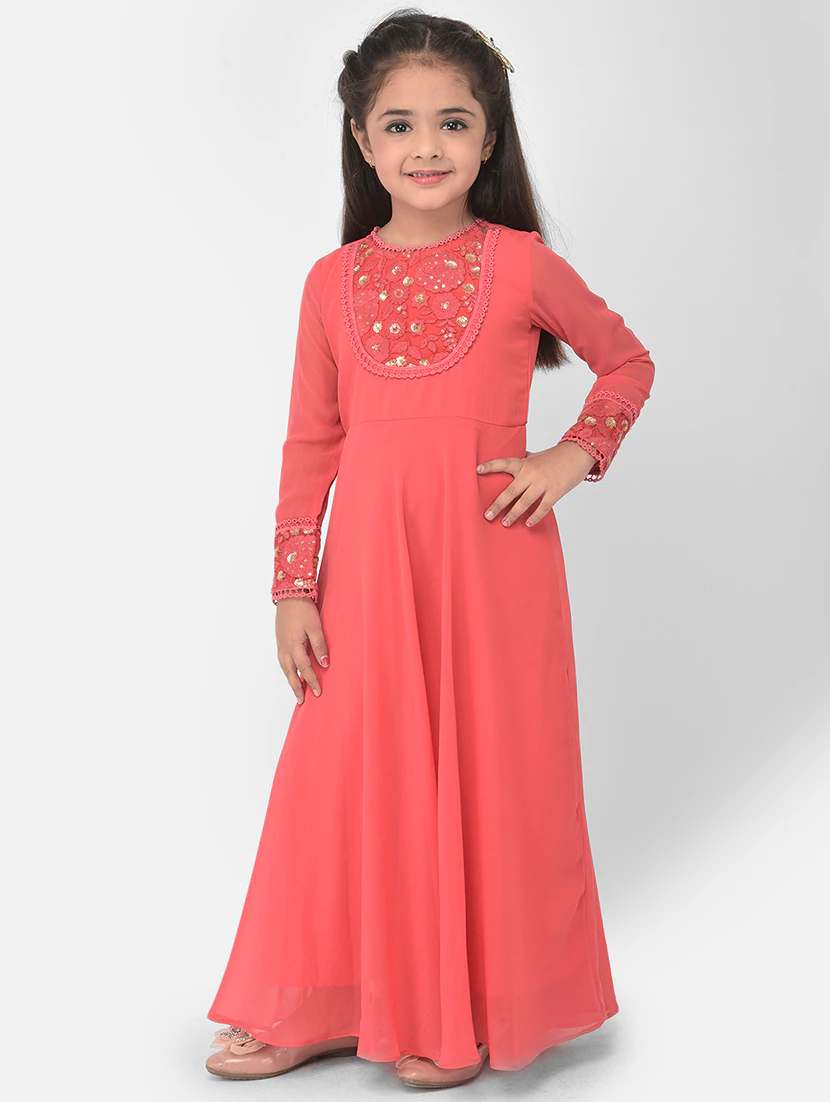 An orange embellished party gown with a full-length, elegant design and intricate details, perfect for making a bold statement at special events.
